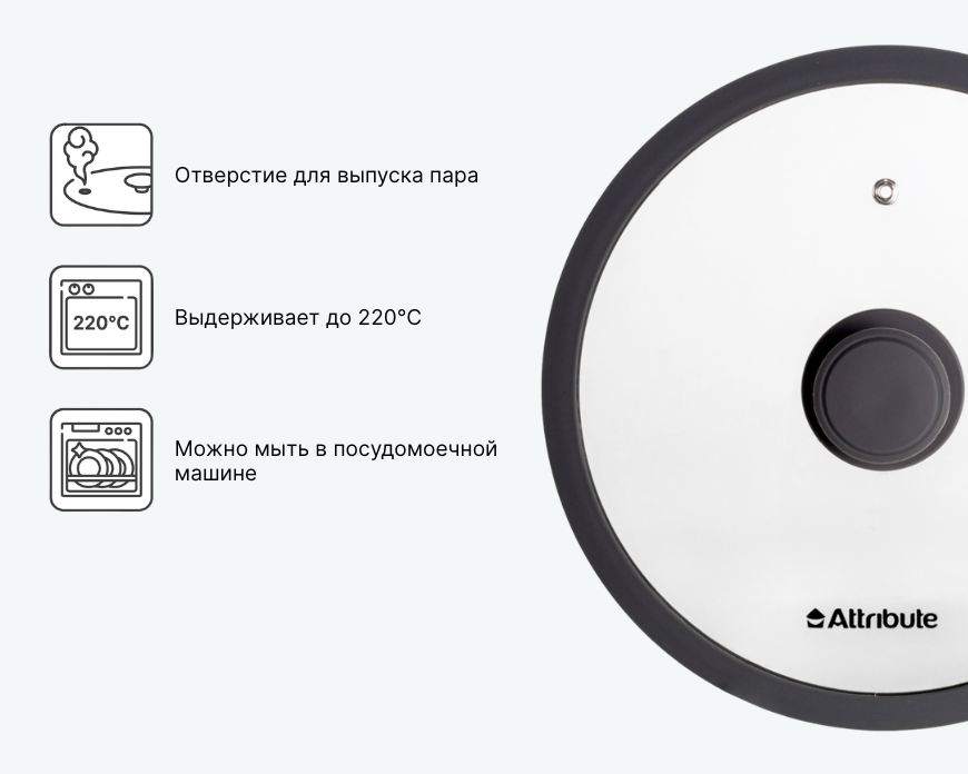 - — Ручка крышки не нагревается — можно использовать без дополнительных прихваток.
