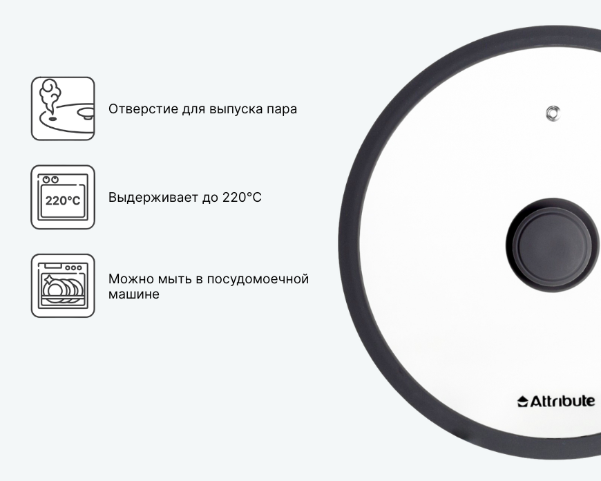 - — Ручка крышки не нагревается — можно использовать без дополнительных прихваток.