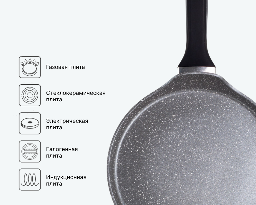 - — Подходит для любых типов плит, в том числе индукционных. Не используйте сковороду в духовке.