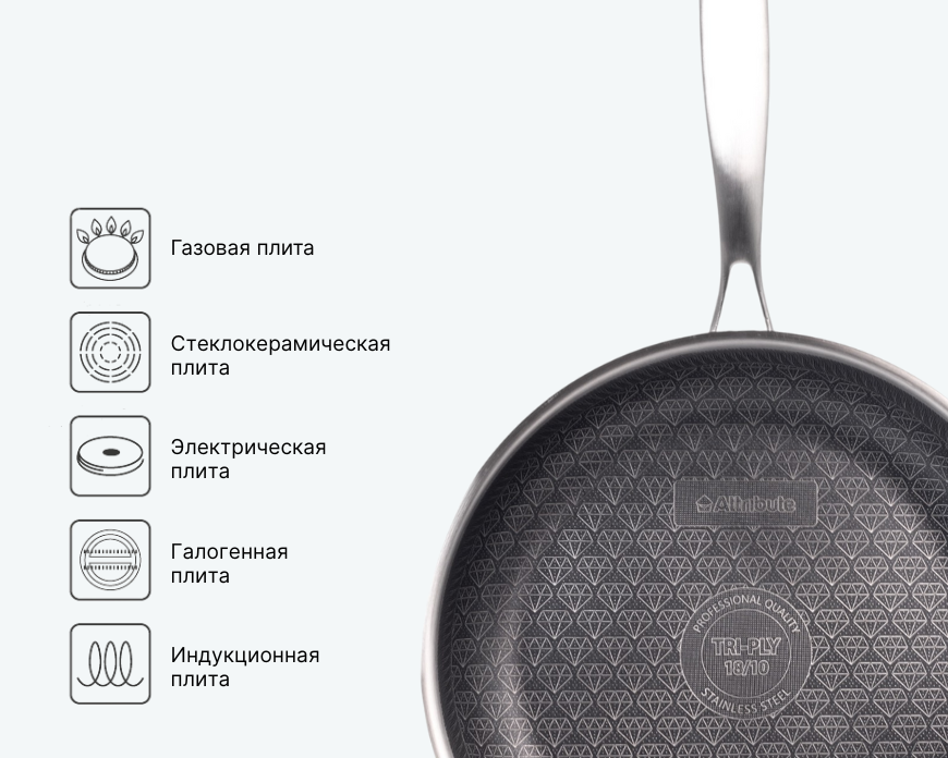 - Сковорода подходит для всех плит, включая индукционные, и посудомоечной машины.