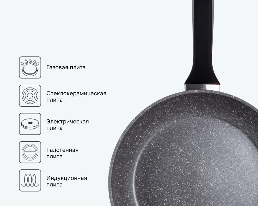 - — Подходит для любых типов плит, в том числе индукционных. Не используйте сковороду в духовке.
