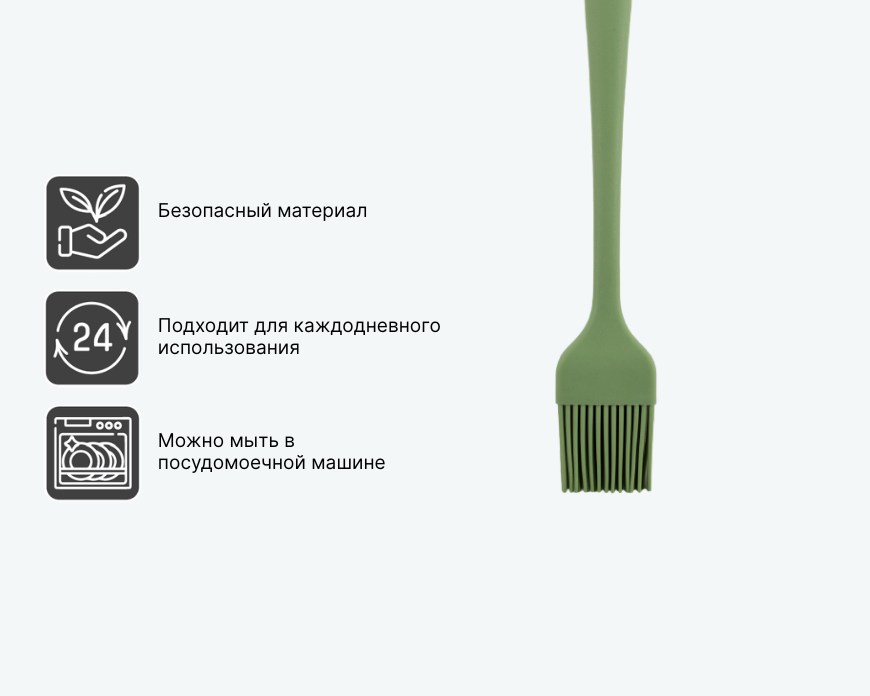 Кулинарная кисть OLIVE из цельнолитого пищевого силикона предназначена для нанесения масла, соусов или глазури. Устойчива к нагреву и не впитывает запахи, подходит для работы с тестом и маринадами. Гибкие щетинки равномерно распределяют жидкости, а эргономичная ручка обеспечивает удобство при длительном использовании.