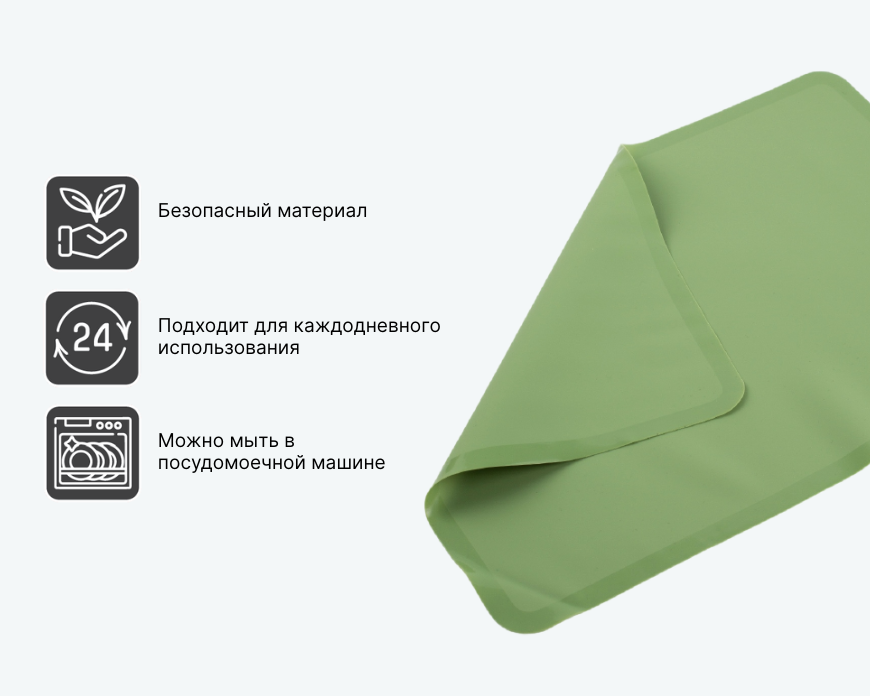 Силиконовый коврик OLIVE подходит для запекания, раскатки теста и заморозки продуктов. Его антипригарная поверхность не требует промасливания, а термостойкость от -40°С до 230°С позволяет использовать мат в разных типах духовок. Он легко очищается, может применяться как прихватка и не занимает много места при хранении.