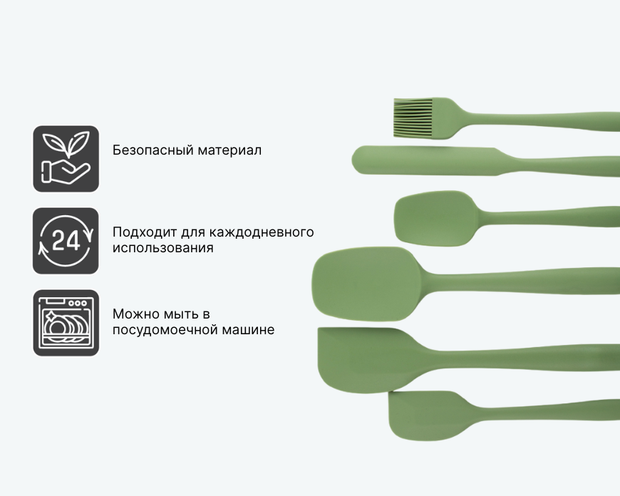 Многофункциональный набор из шести силиконовых аксессуаров OLIVE включает кисть и лопатки разных размеров, подходящих для готовки, выпечки и гриля. Изделия устойчивы к перепадам температур, не впитывают запахи и легко моются. Благодаря эргономичной форме и гибким краям, каждый инструмент удобно использовать как дома, так и на даче.