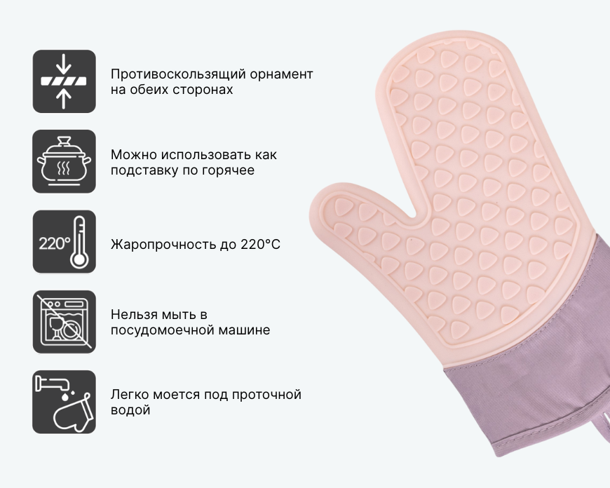 - — Используйте для безопасного захвата горячей посуды, противней и форм.