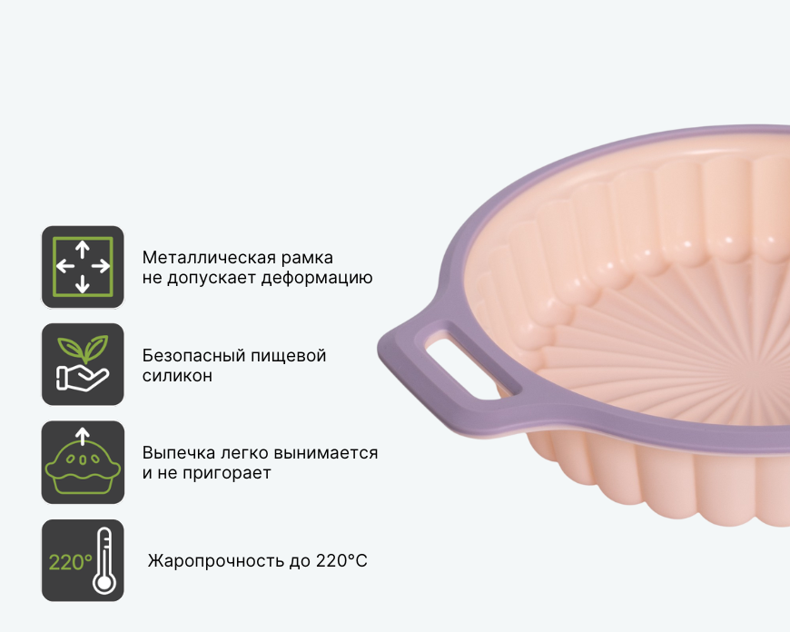 - Безопасный пищевой силикон с жаропрочностью до 220 °C.