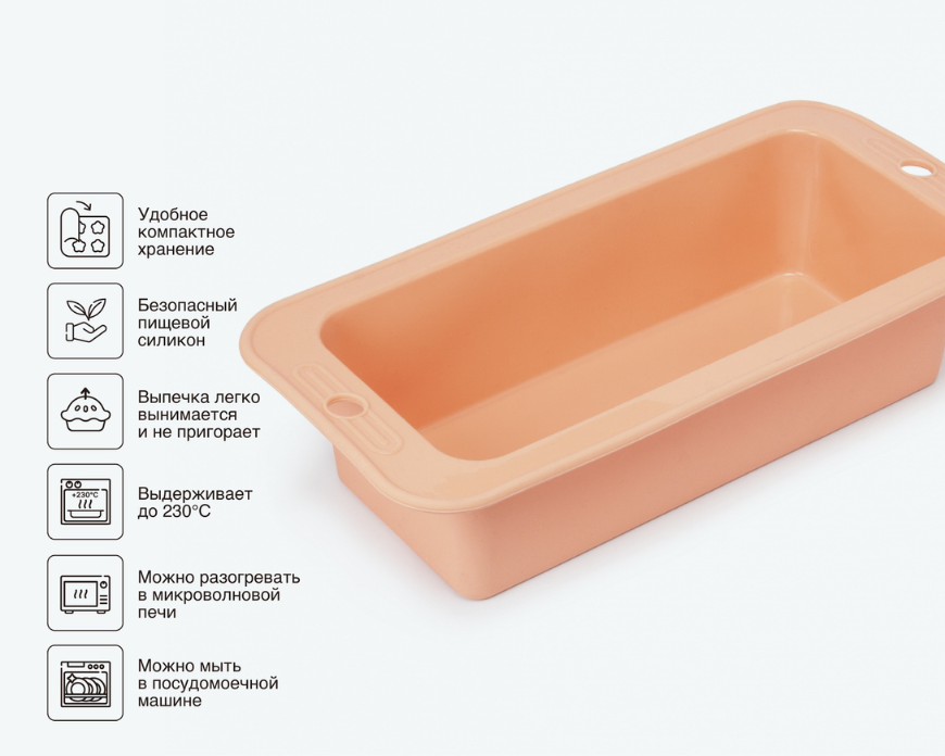 Прямоугольная форма APRICOT 27 х 13 см в нежном персиковом цвете идеально подходит для выпечки уютного домашнего хлеба и пирогов. Легкое извлечение готового теста, благодаря силиконовому материалу, обеспечит аккуратность и сохранит форму приготовленного блюда.